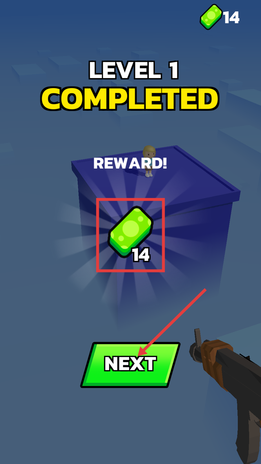 4、结算领取【绿宝石-14】,点击【NEXT】,积累资源为后续关卡做准备。