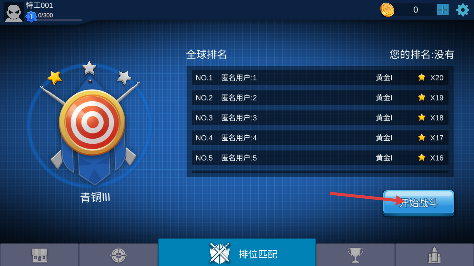 1、排位界面点击【开始战斗】,以【青铜III】段位参与匹配,初始金币为0,开启狙击对决。