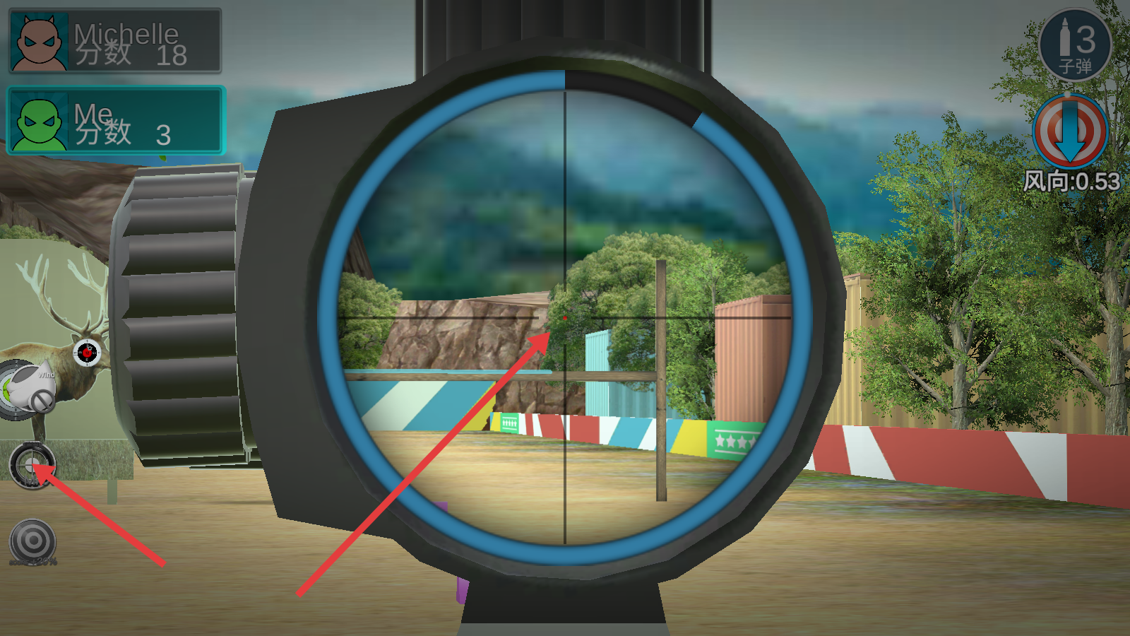 3、切换狙击镜视角,根据【风向-0.53】微调准星,射击提升【分数-3】,追赶Michelle。