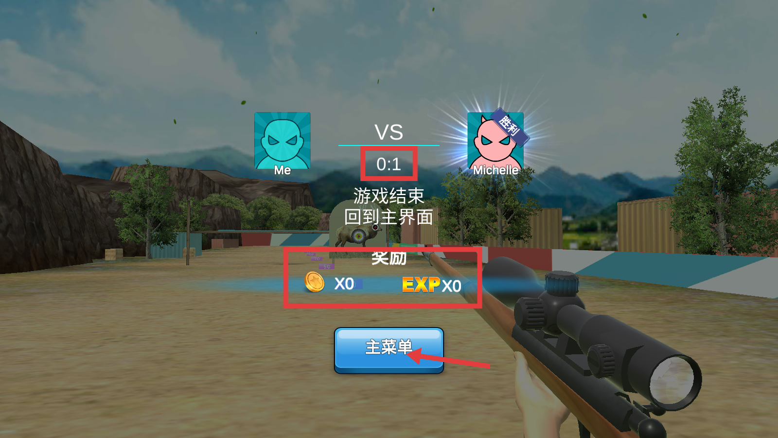 4、结算显示【0:1】败北,获【金币-X0】与【EXP-X0】,点击【主菜单】返回,筹备再战。