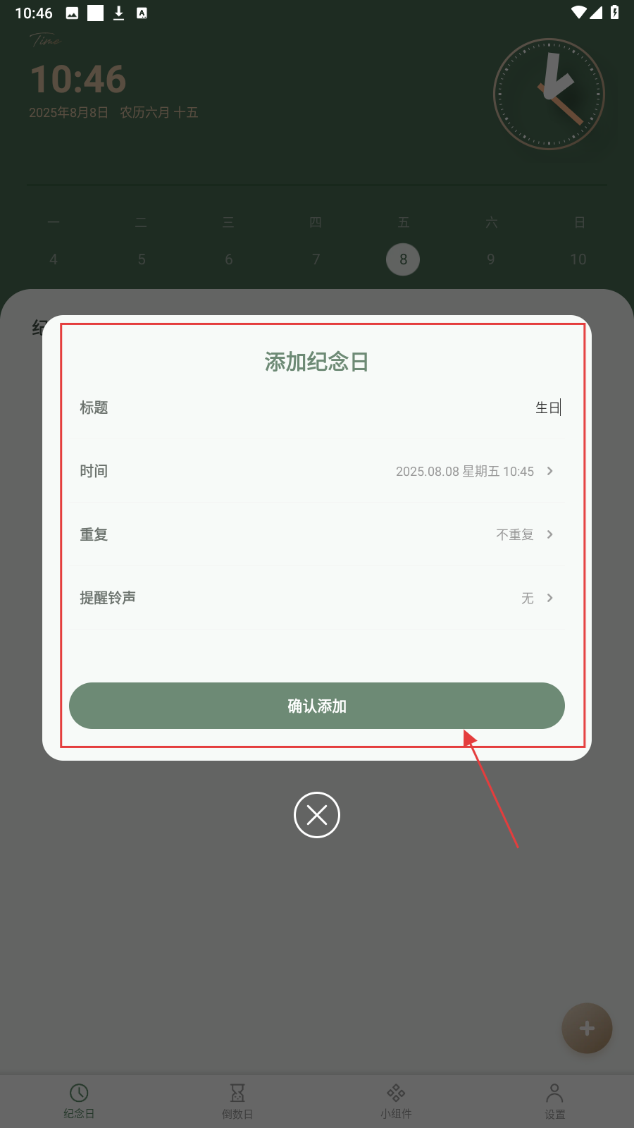 2、在【添加纪念日】页面,设置标题、时间等内容,设置完成后点击【确认添加】。