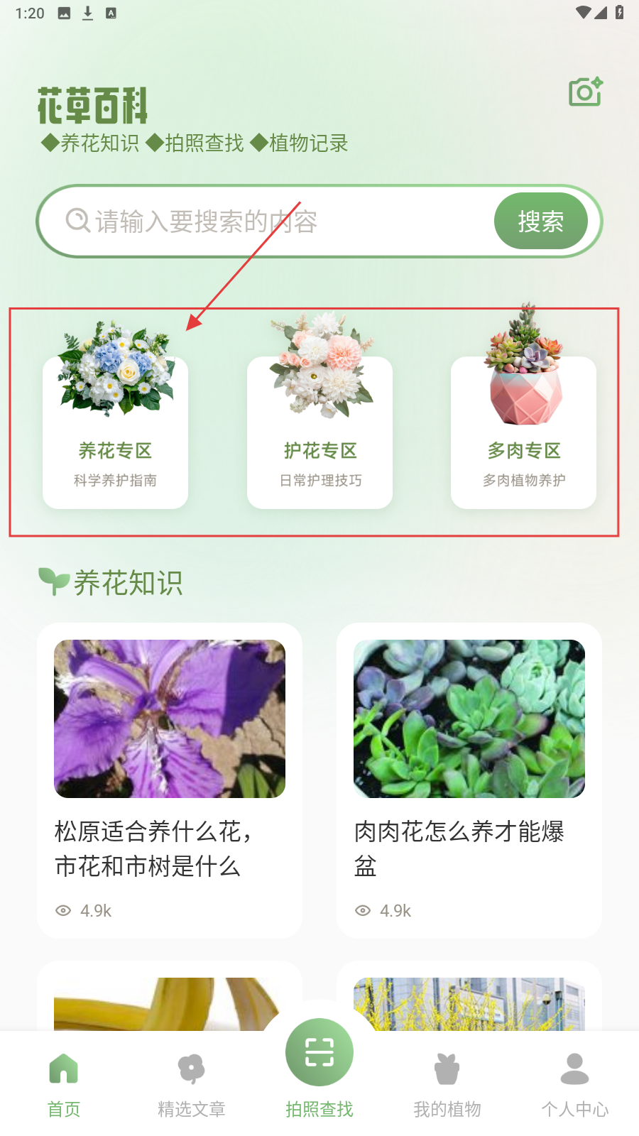 1、进入首页,选【养花专区】【护花专区】等,获取对应植物养护知识。
