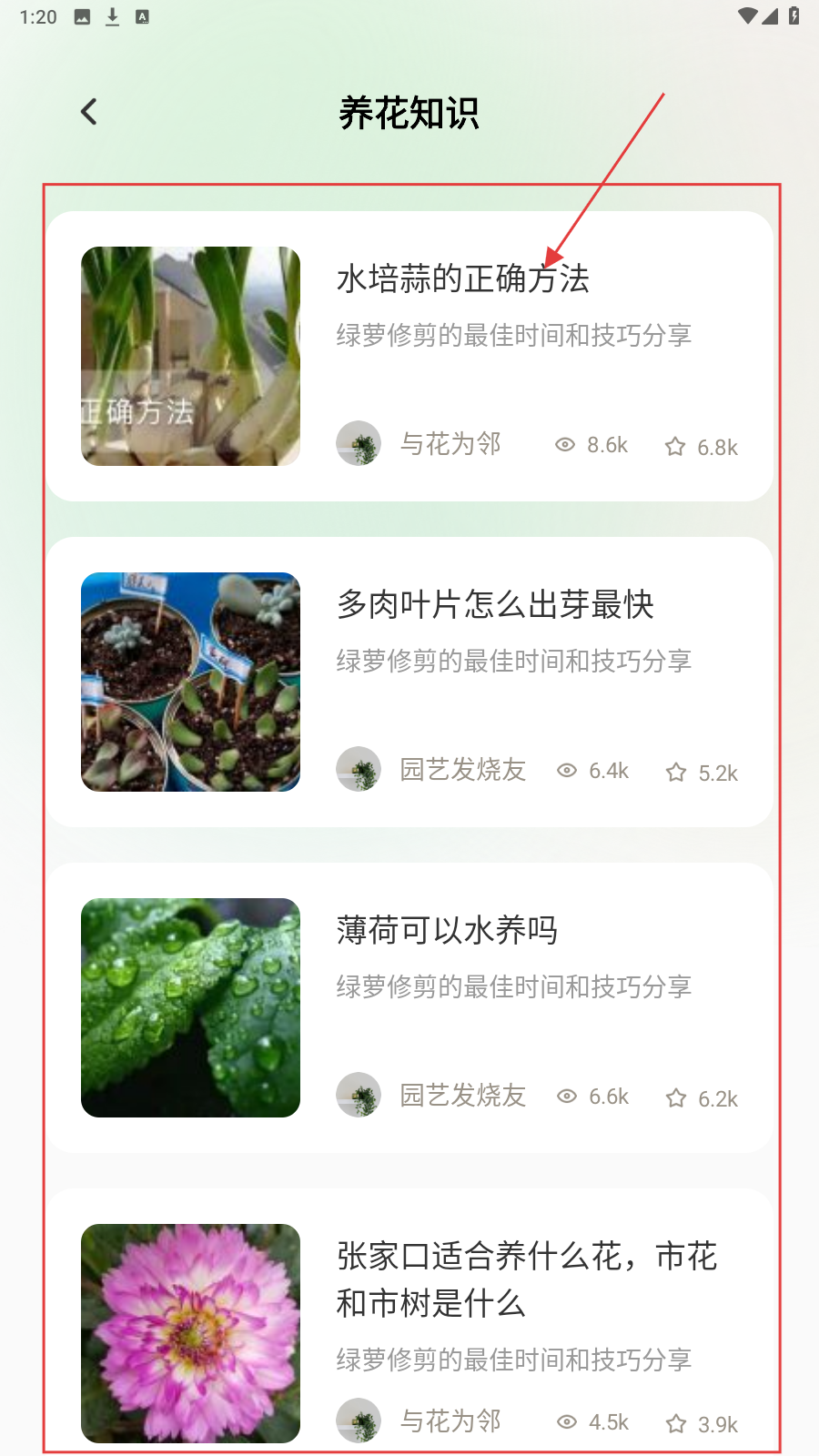 2、在【养花知识】列表,点感兴趣文章,如《水培蒜的正确方法》,查看详细内容。