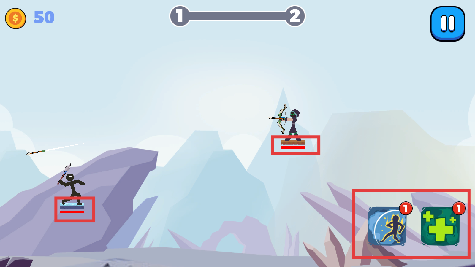 1、极简视觉呈现:黑白基调突出火柴人动作张力,背景色块区分不同战斗区域聚焦核心操作界面减少视觉干扰。