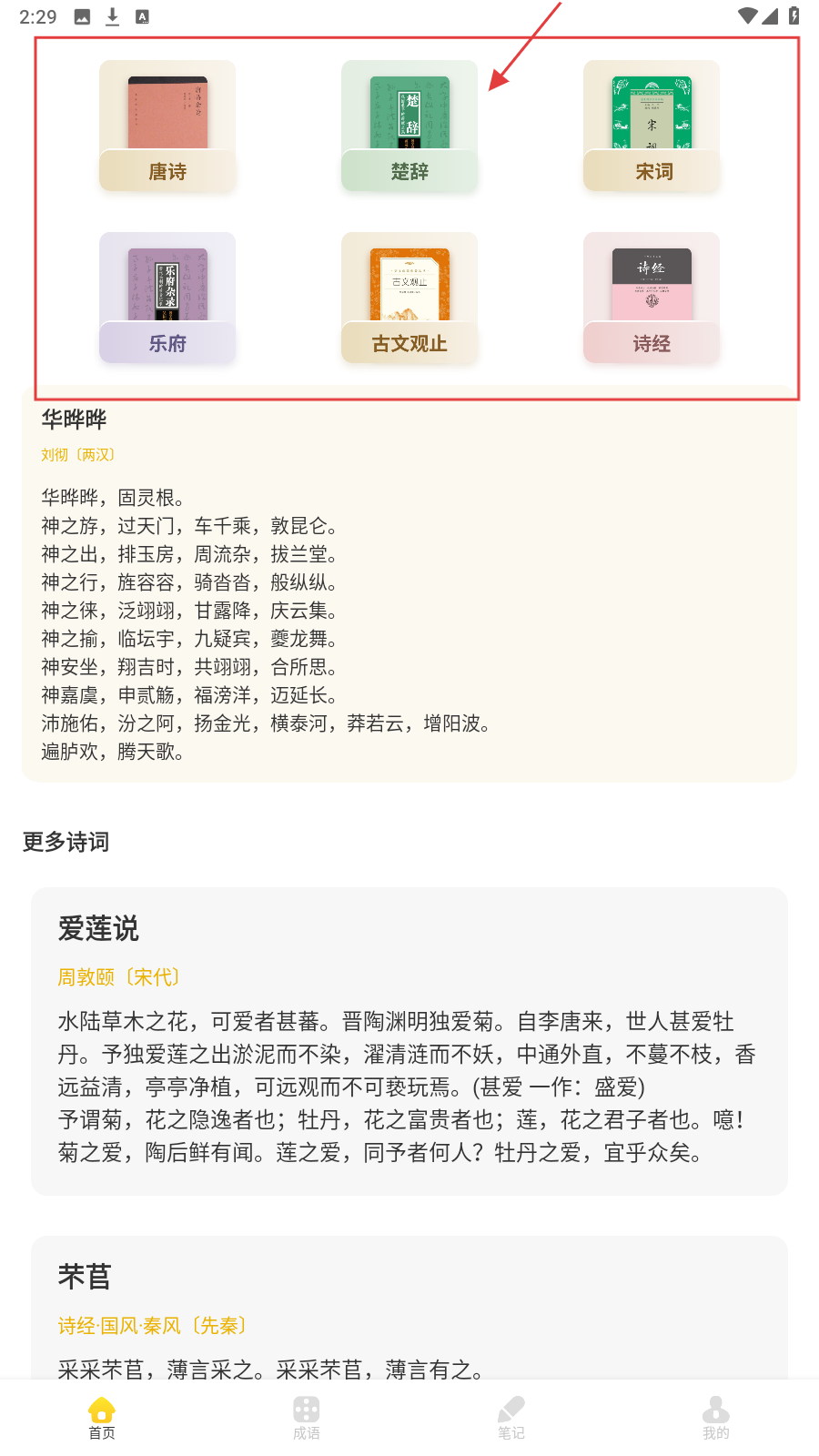 1、进入首页,选【唐诗】【楚辞】等分类,开启古典文学阅读。