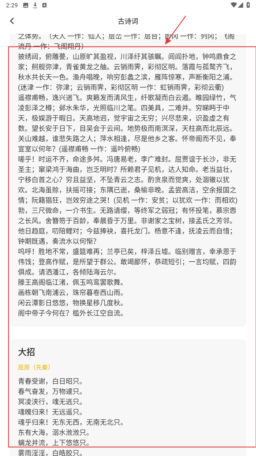 2、在【古诗词】页,浏览文章,选感兴趣内容深入阅读学习。