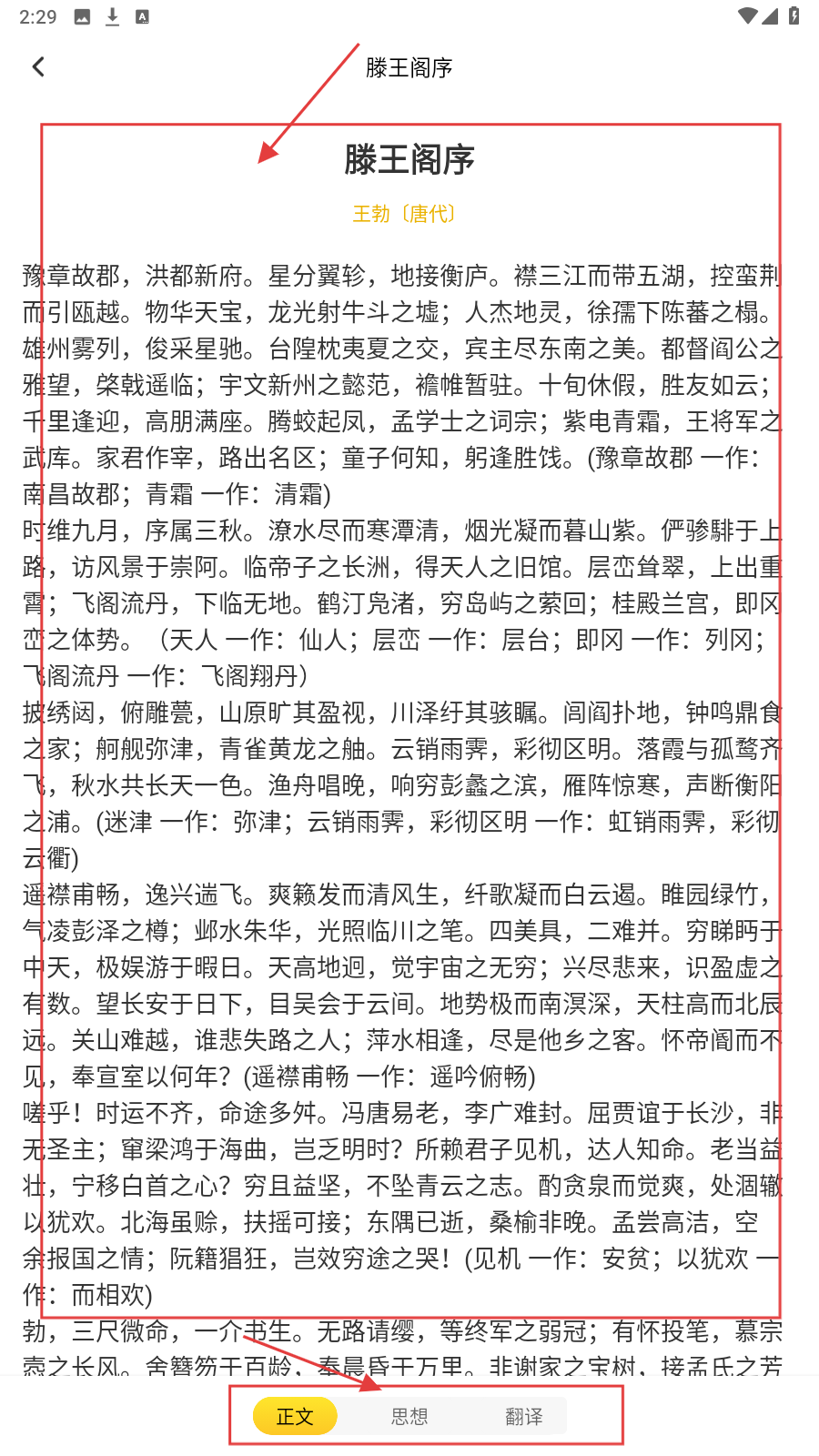 3、查看《滕王阁序》,点【正文】标签,阅读原文内容。