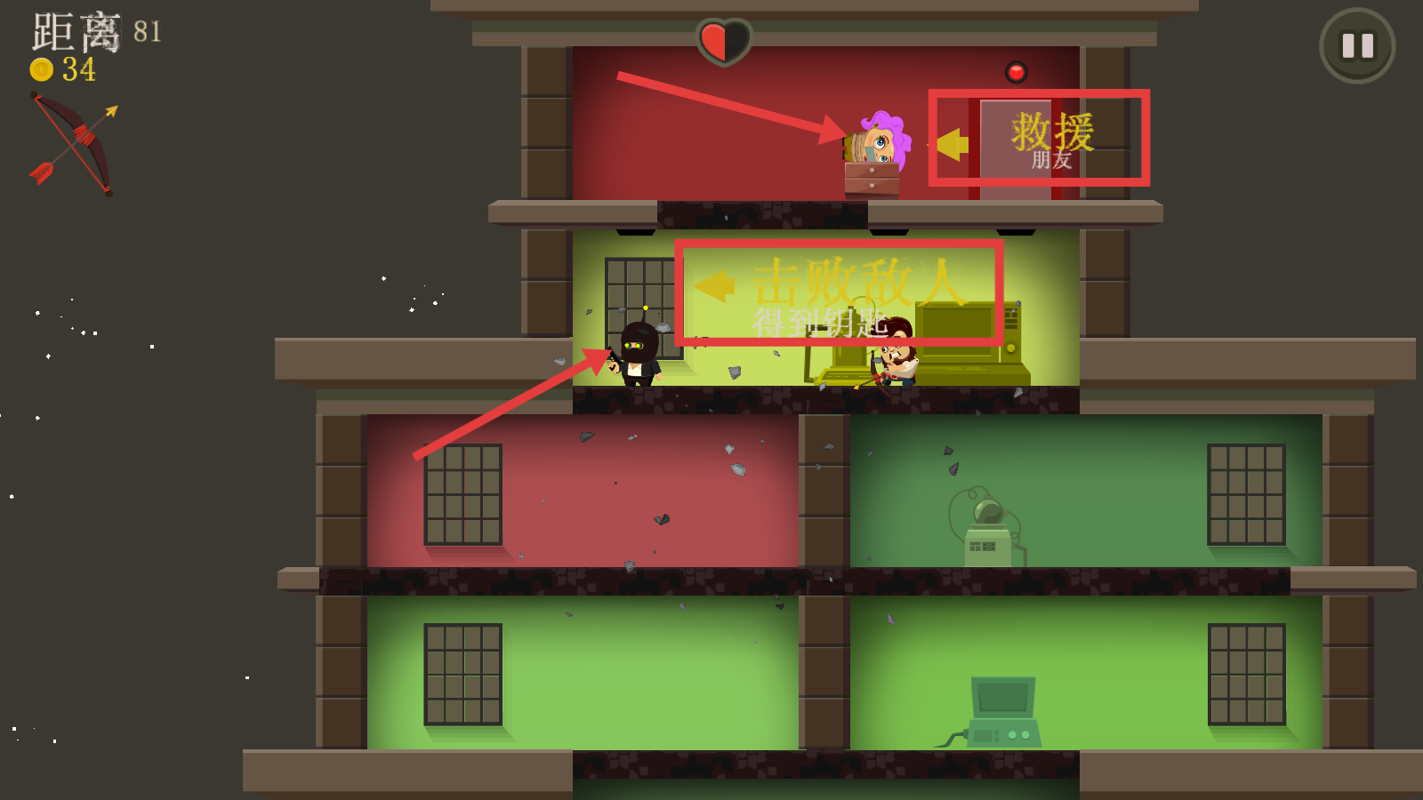 3、关卡内先【击败敌人-得到钥匙】,再前往上层区域【救援朋友】,逐步完成楼层任务。