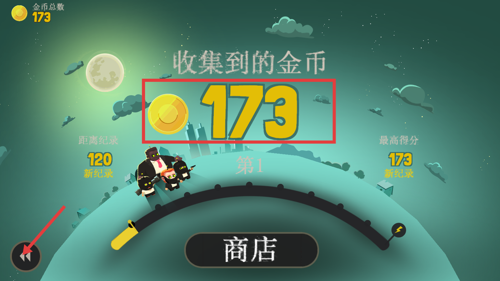 4、结算时查看【收集到的金币-173】,可点击【商店】消费,或通过左下角箭头继续挑战。