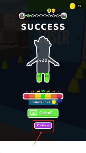 3、完成任务:成功到达墙顶后,点击“Continue”按钮领取奖励并继续游戏。