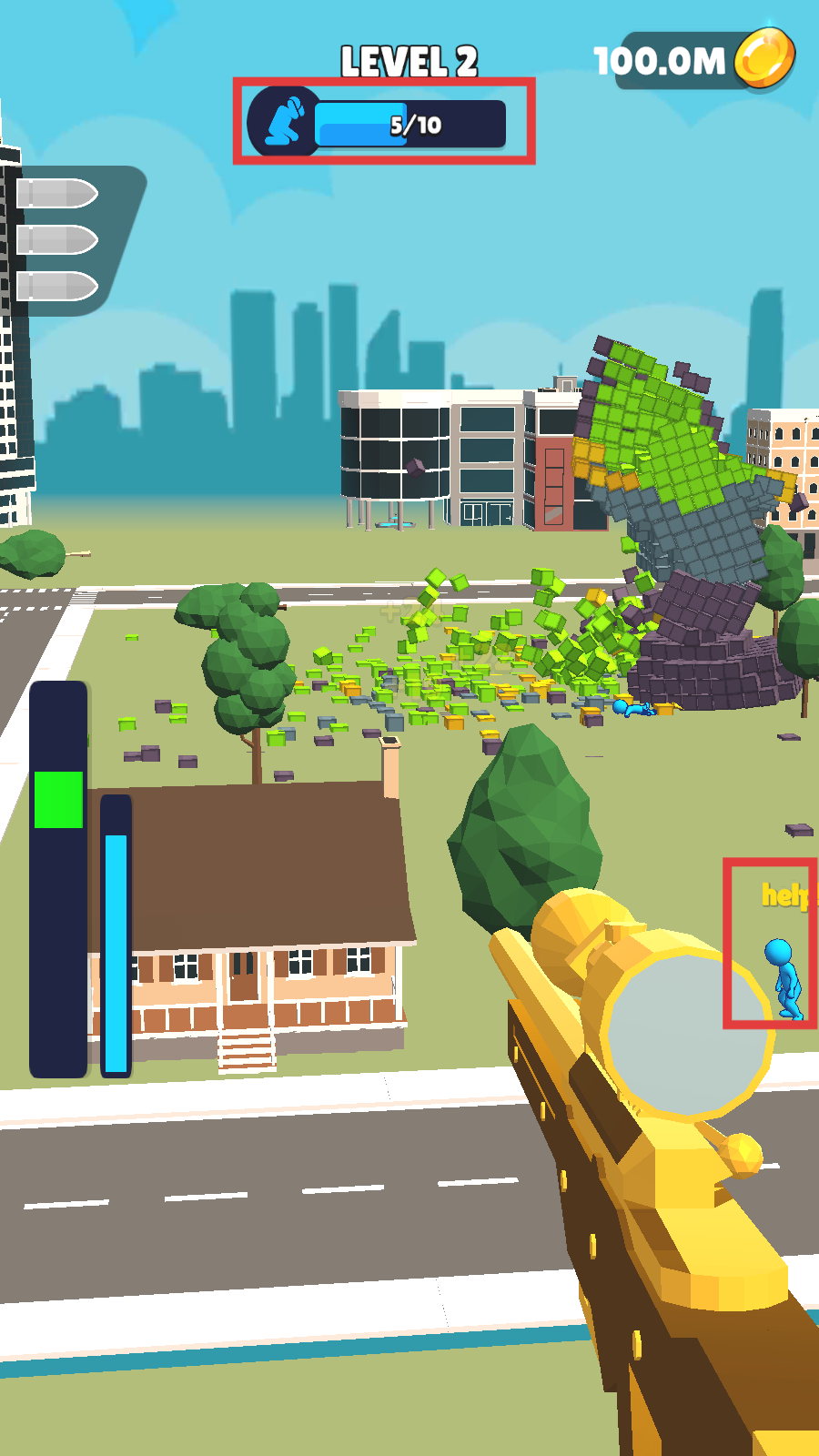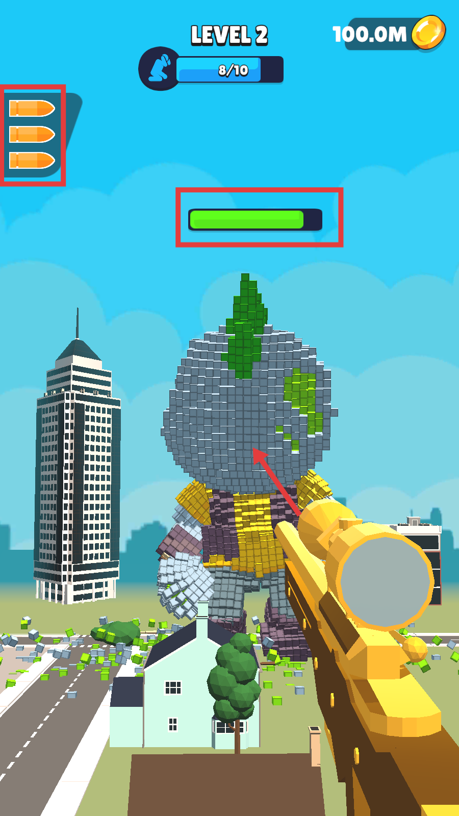 2、战斗中关注左侧【子弹】数量,瞄准巨型敌人射击并关注敌人上方的【绿色血条】,持续射击消耗血量。