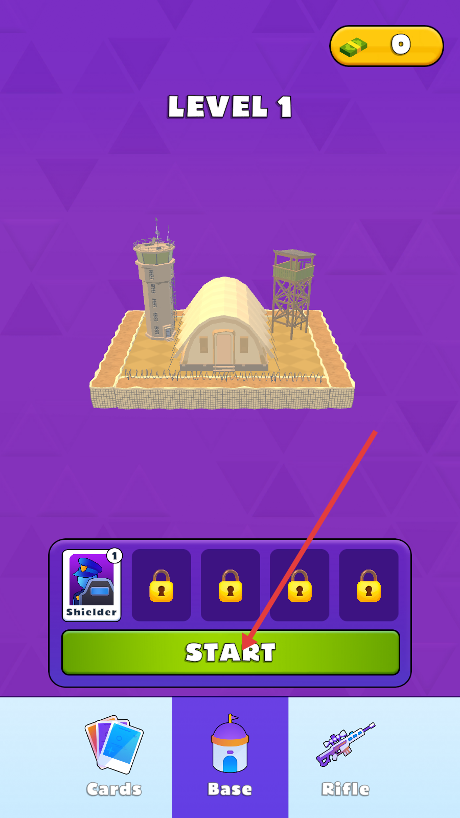 1、点击【START】开启【LEVEL-1】,选用初始角色【Shielder】,进入基地战准备迎敌。