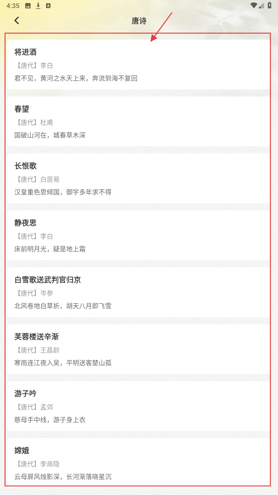 2、点分类如【唐诗】,浏览李白《将进酒》等作品列表,选感兴趣诗词。