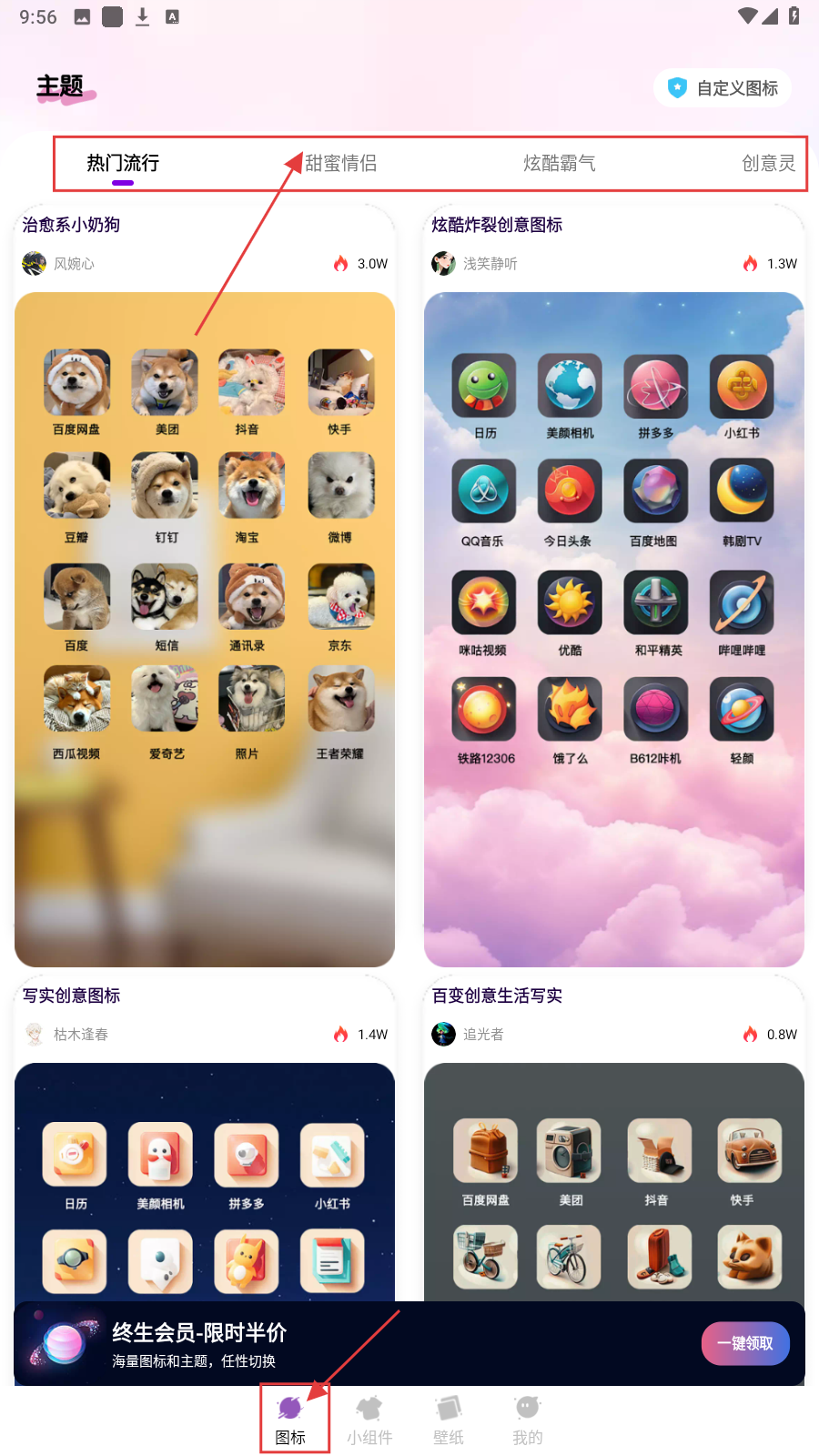 1、打开应用,在【图标】页,在上方分类栏选择喜欢的类型,点击心仪的图标主题。