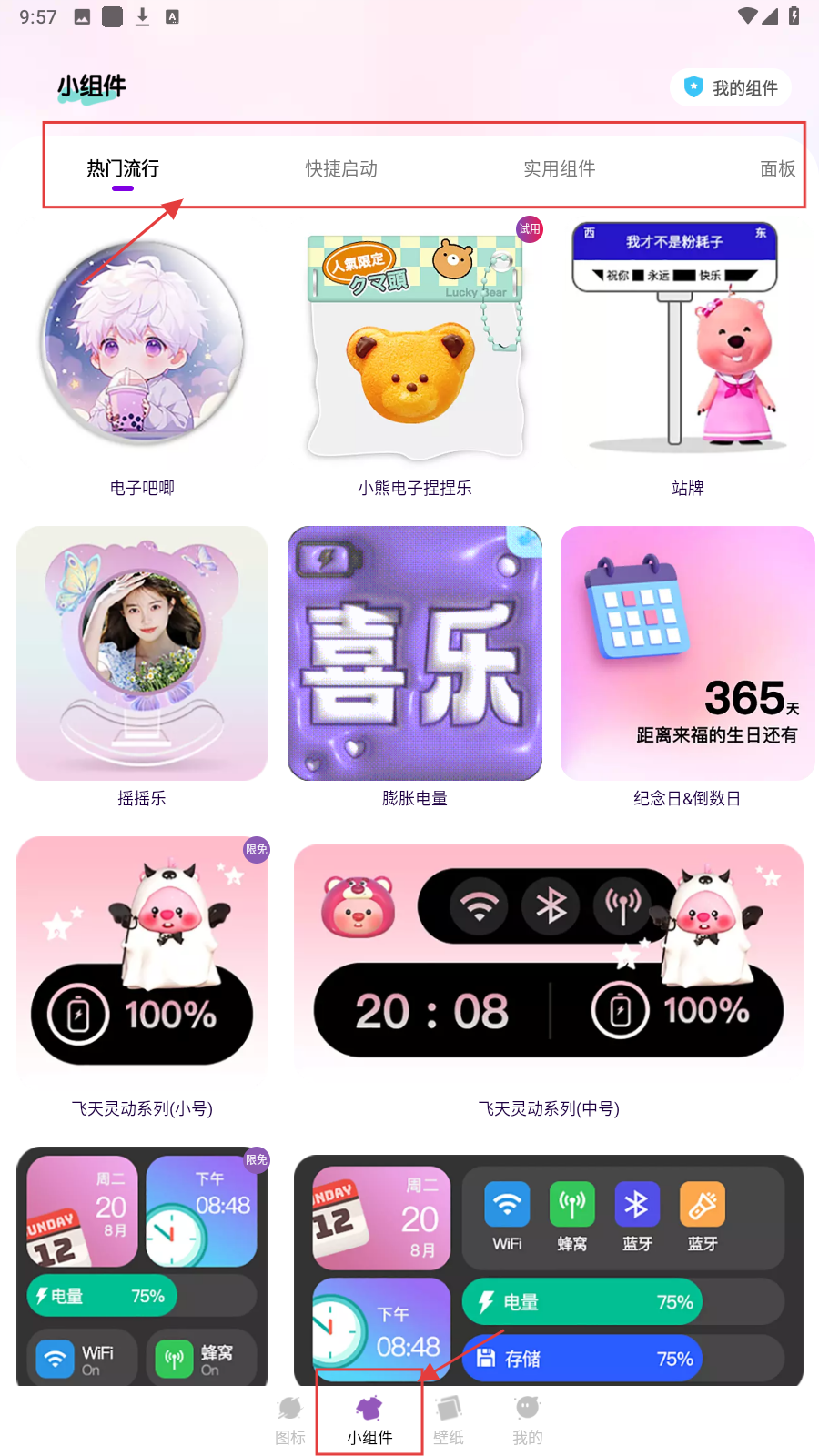 3、切换至【小组件】页面,选择心仪的小组件并点击。