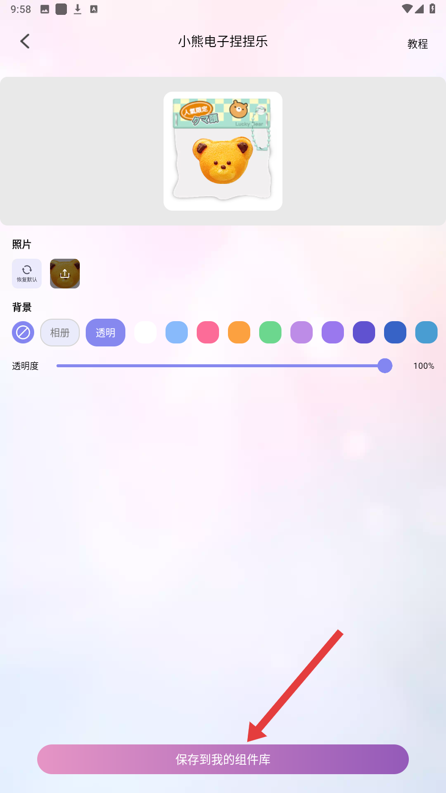 4、点击进入小组件设置页面,按照喜好设置【照片】、【背景】等内容,设置完成点击【保存到我的组件库】即可。