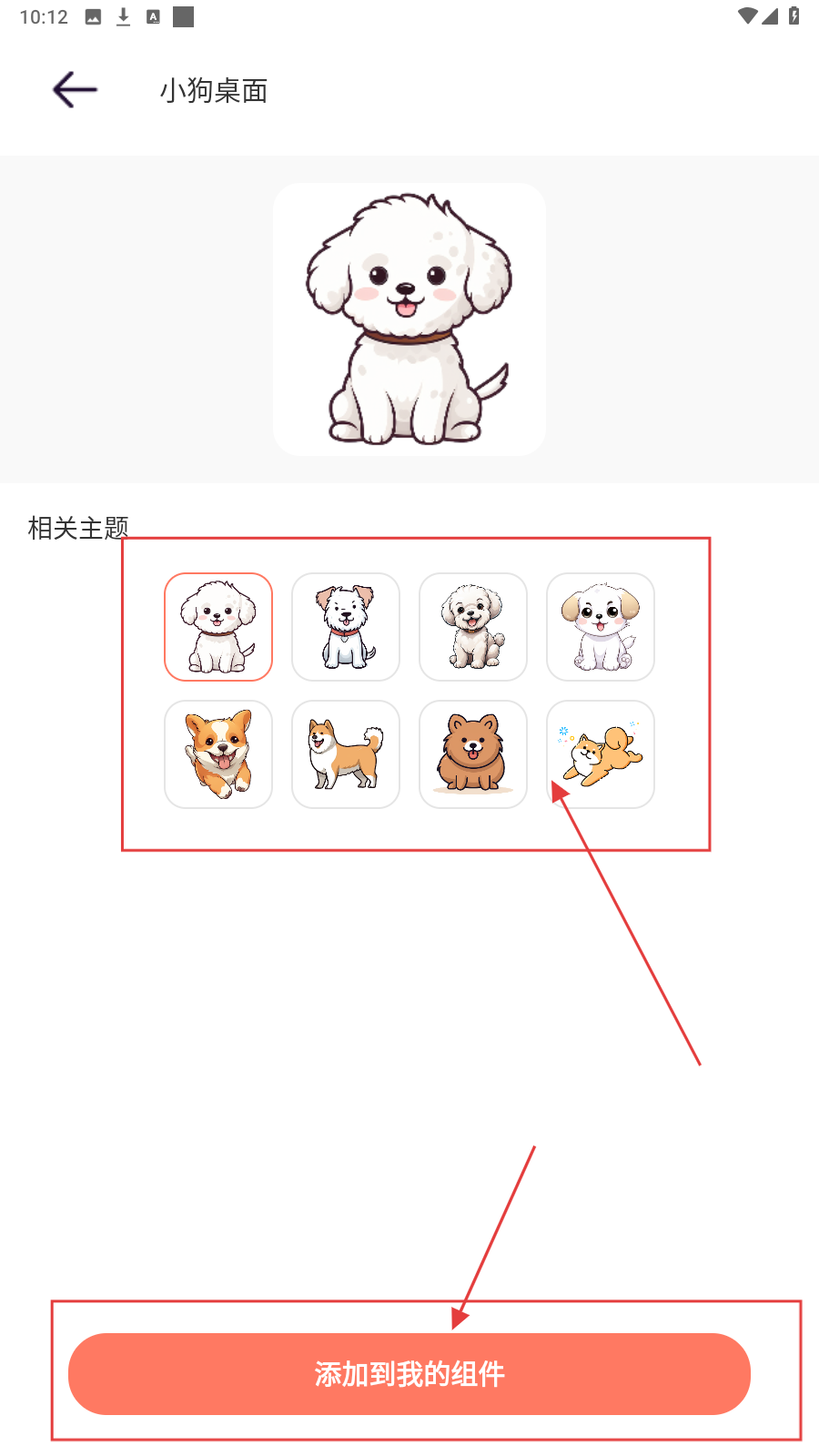 2、进入【小狗桌面】页面,点击下方【添加到我的组件】即可。还可以在【相关主题】栏下选择其他的相关小组件哦。