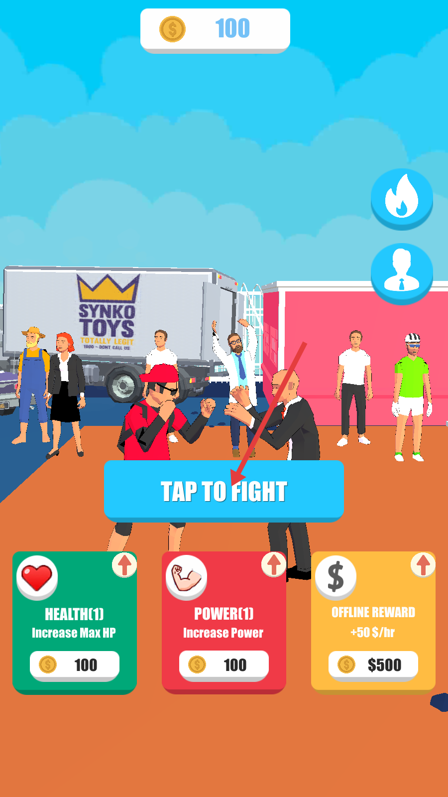 1、主界面点击【TAP-TO-FIGHT】开启战斗,可先花【100-金币】升级属性,强化初始战力。
