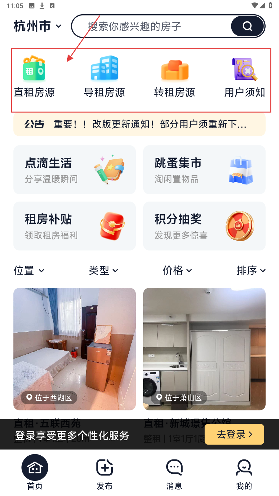 1、打开应用,在【首页】有直租房源、导租房源等服务按钮,按需选择,如点击【直租房源】。