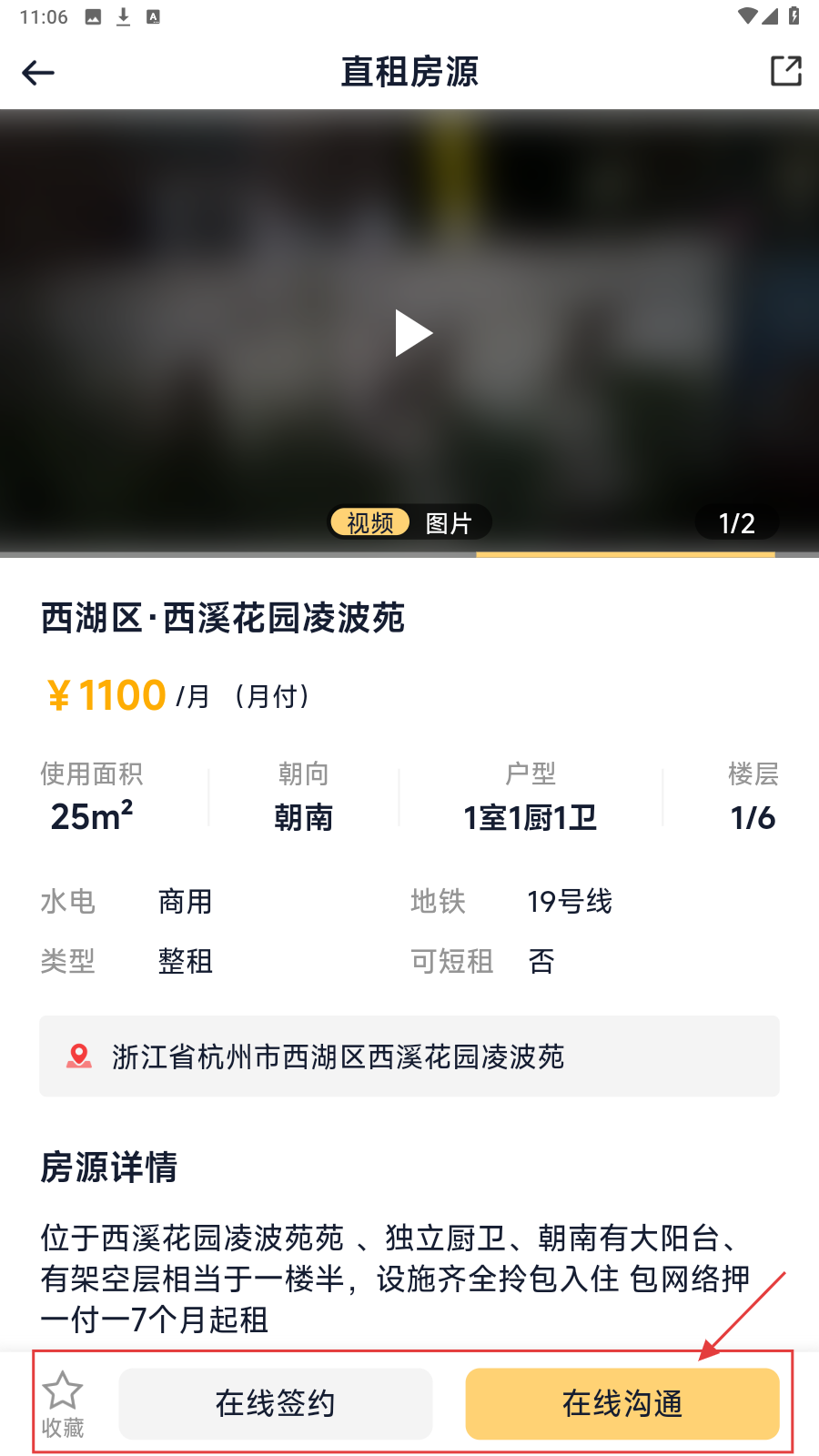 4、进入房源详情页,可以查看视频等内容,了解房源信息,如若有意向可以点击【在线沟通】,进一步了解房源详情。