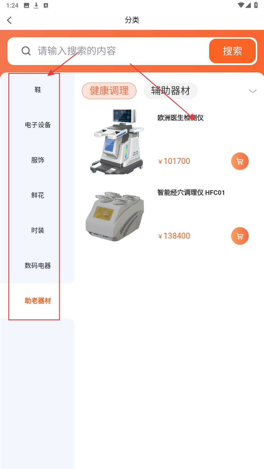 2、在分类页,选左侧类目,如找助老器材相关,点对应进入,查看【健康调理】商品。