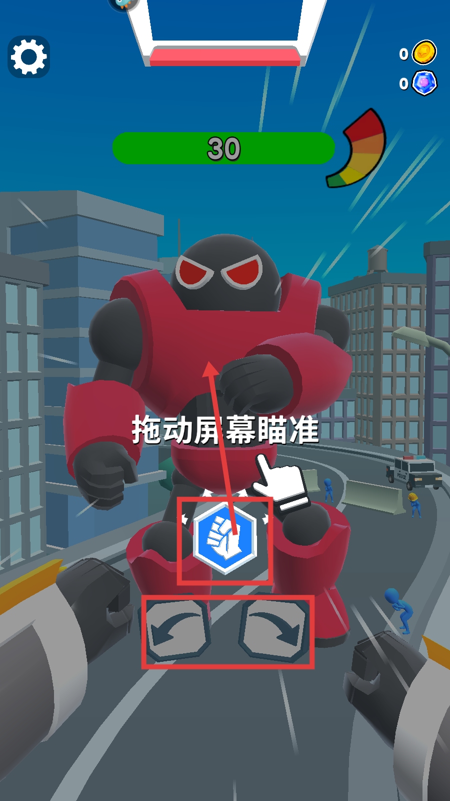 2、对战红色机甲时,按提示【拖动屏幕瞄准】,配合箭头与拳头按键进攻。