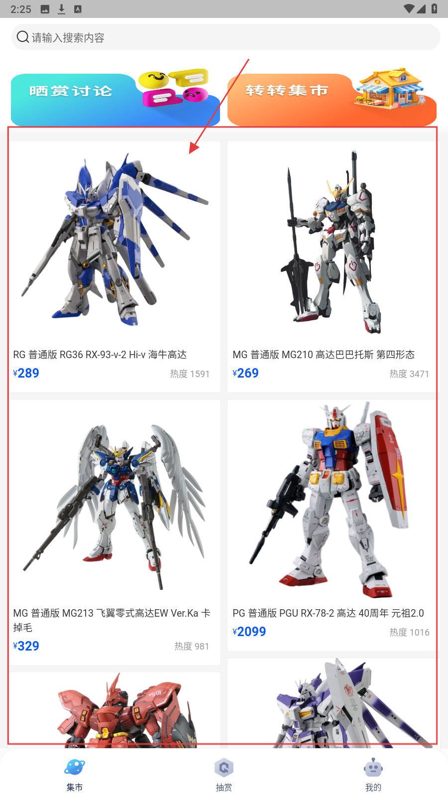 3、进入集市页,浏览高达模型等商品,按热度、价格筛选,定位目标商品。