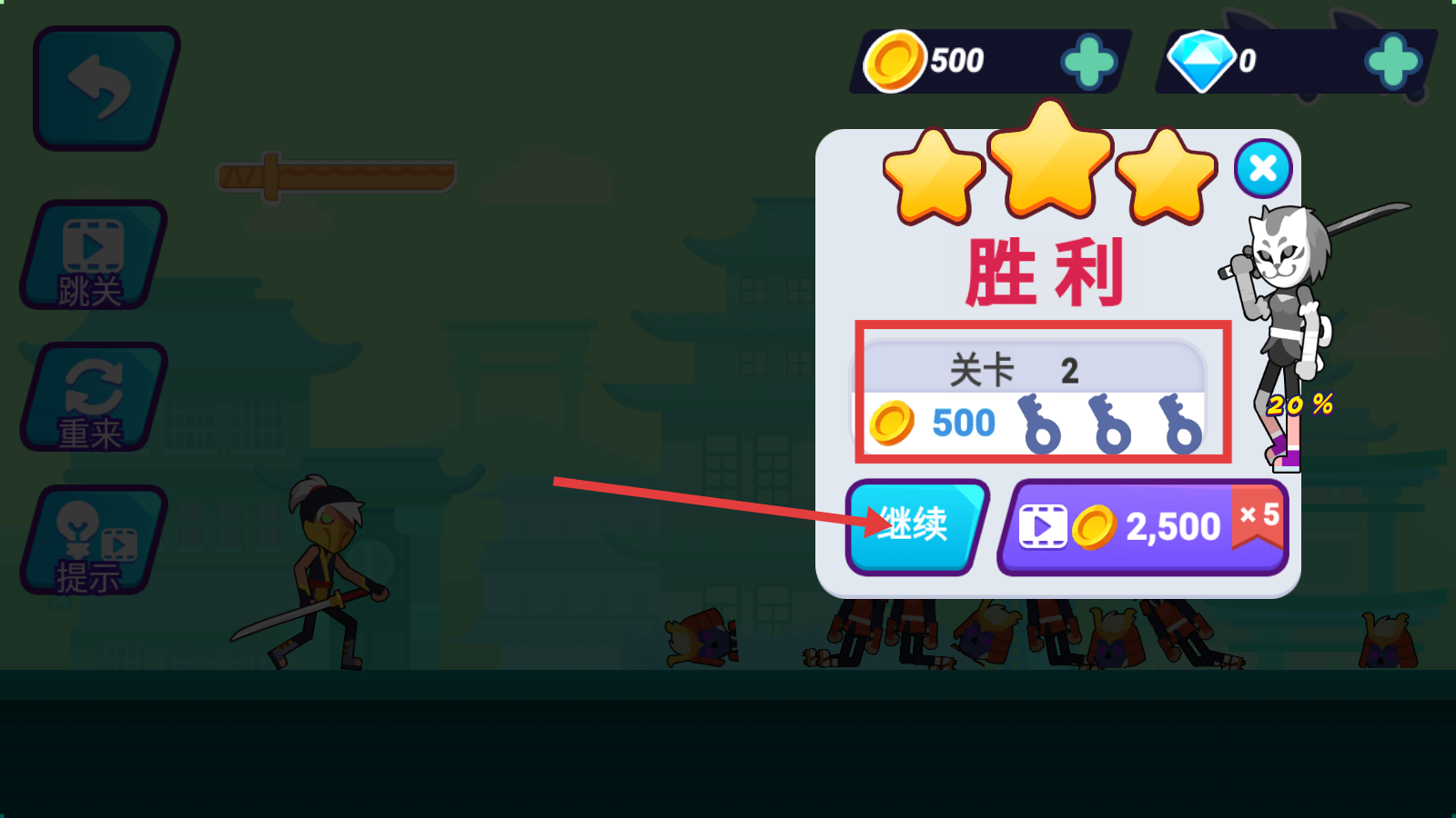 4、关卡2胜利后,获取【500-金币/3把钥匙】,点击【继续】推进后续关卡。
