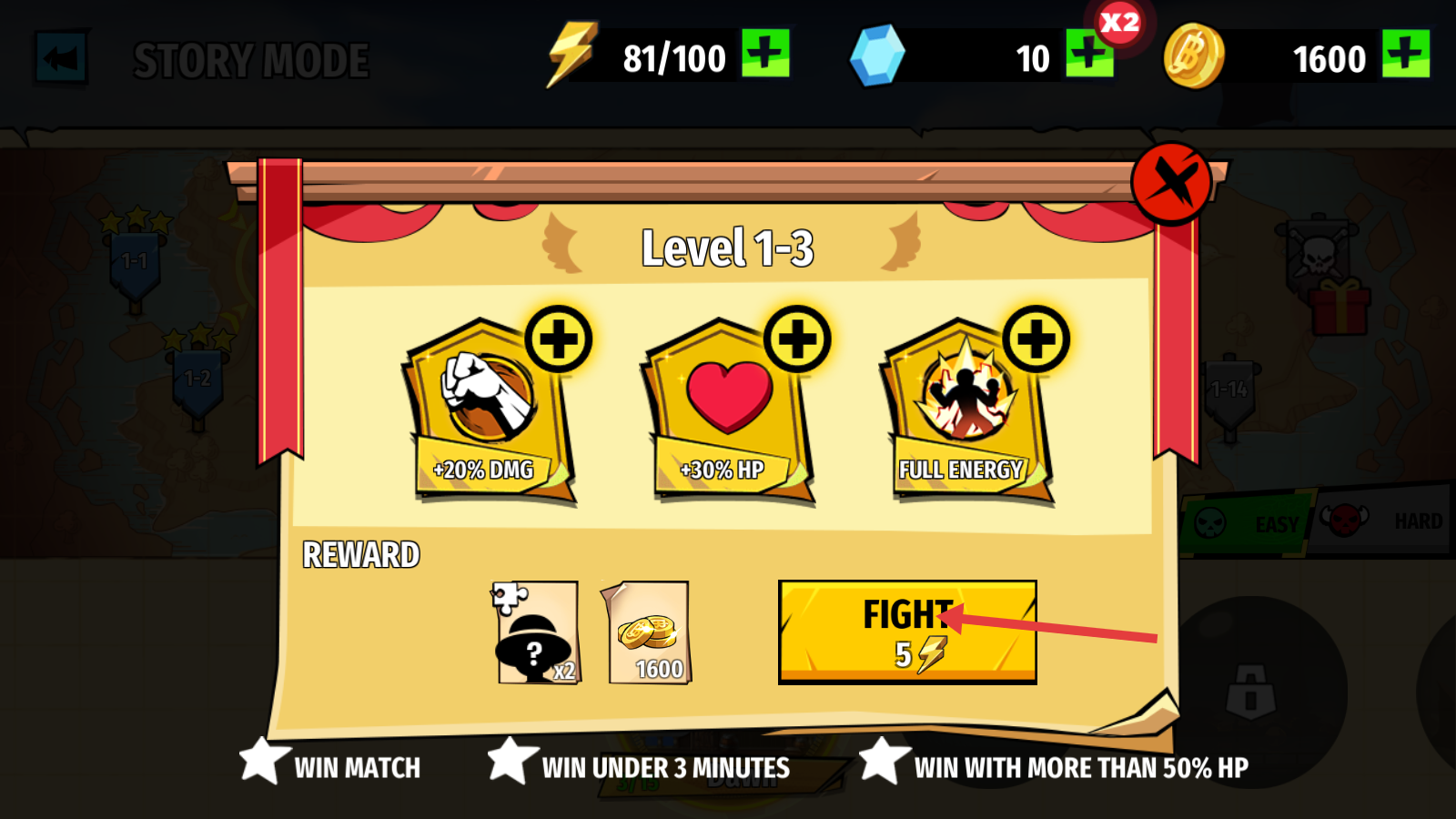 1、挑战【Level-1-3】前,激活【+20%DMG】【+30%HP】【FULL-ENERGY】加成,点击【FIGHT】消耗5体力开战。