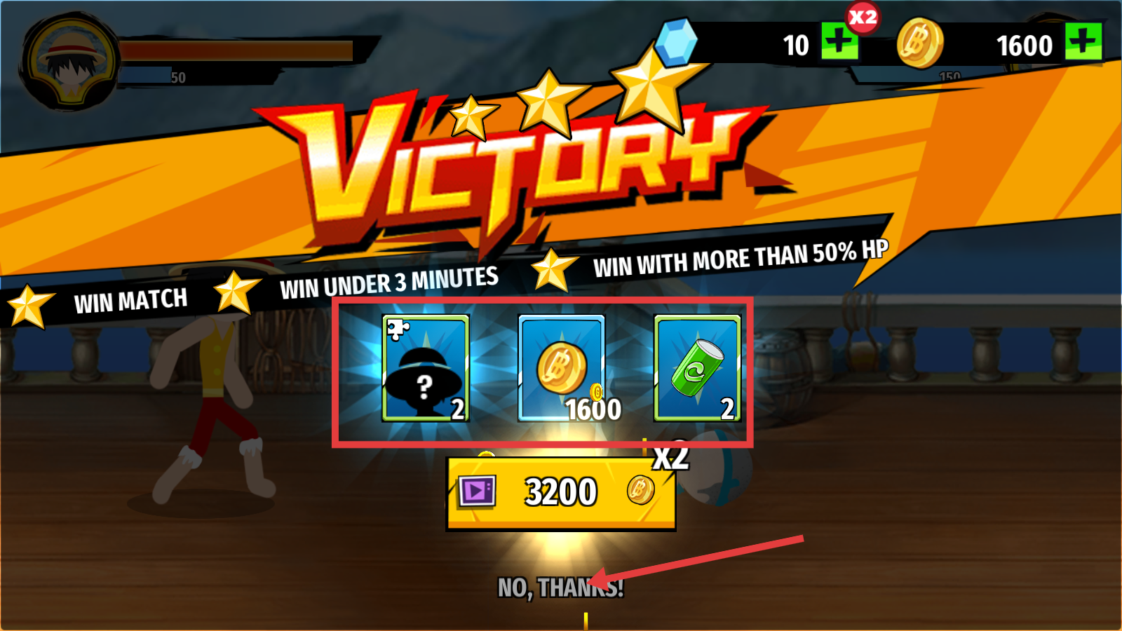 4、通关后领取【碎片-2】【金币-1600】【道具-2】,若不看广告,点【NO,-THANKS!】返回。