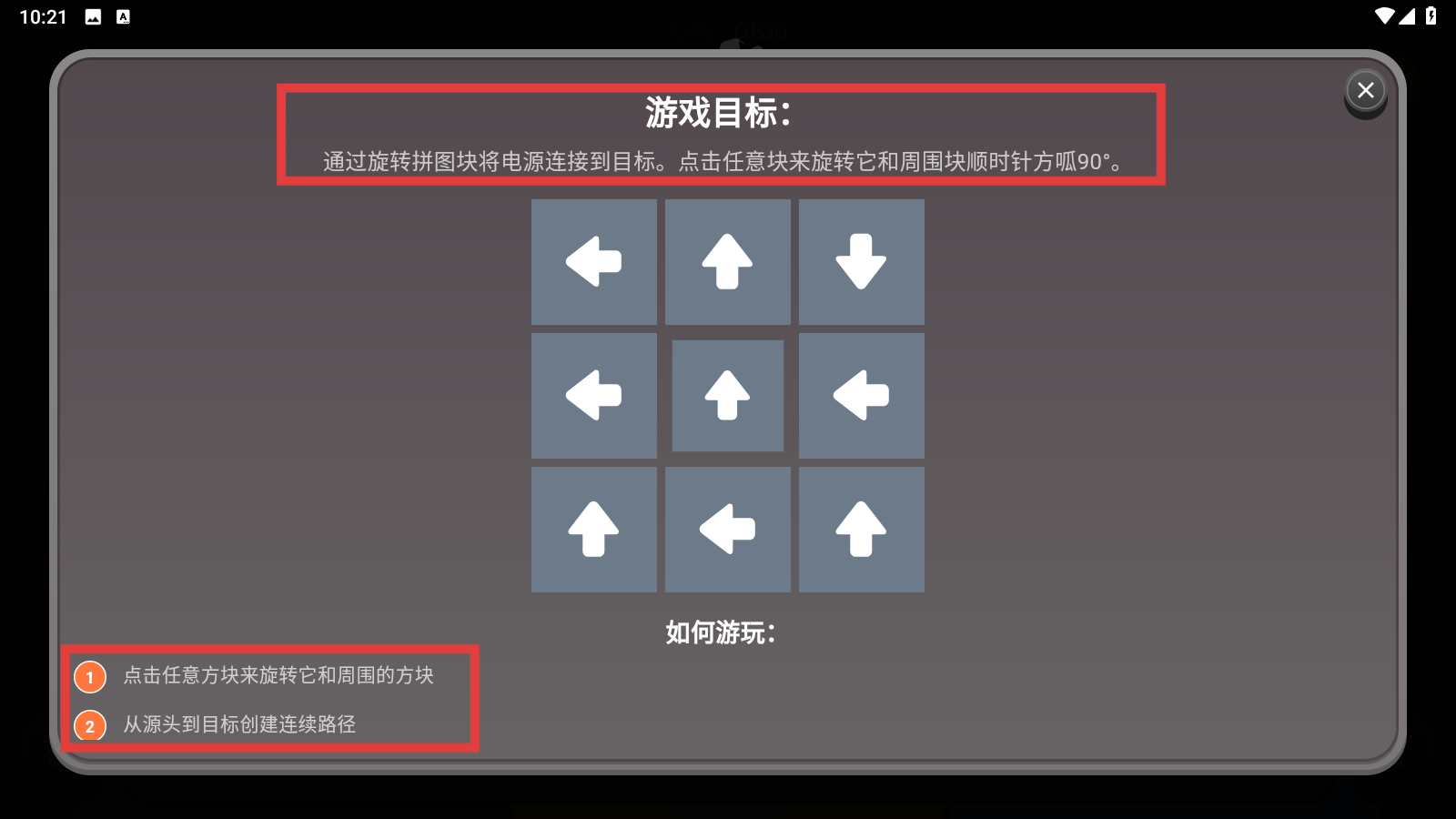 2、游戏目标为【旋转拼图块-连接电源到目标】,按提示点击方块,旋转构建连续路径。