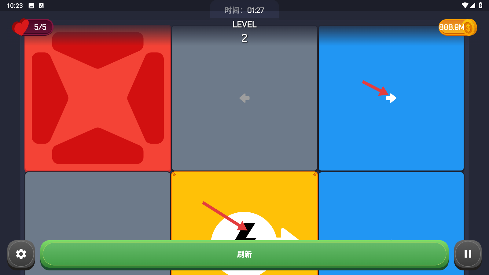 3、关卡内观察方块箭头,点击调整方向,若布局不佳,可使用下方【刷新】功能重置。