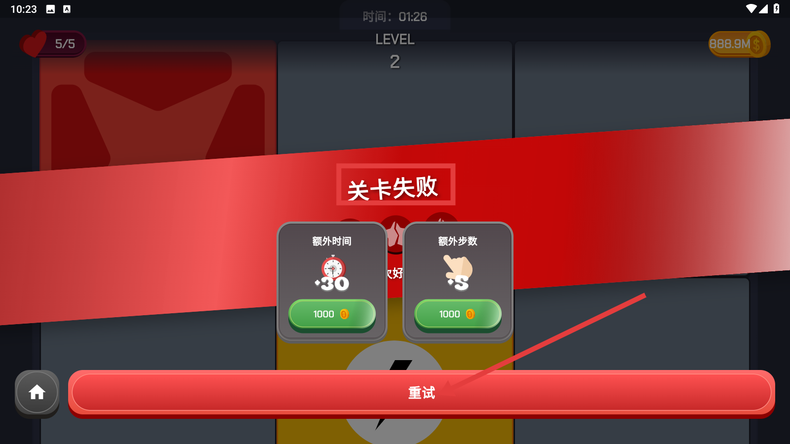 4、若限时未完成,触发【关卡失败】,点击红色【重试】按钮,重新挑战该关卡。