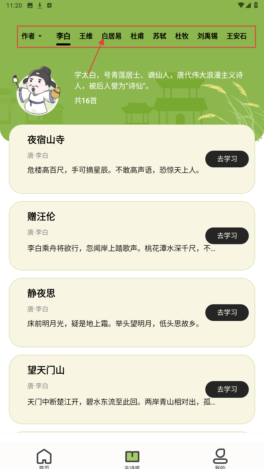 1、打开应用,在【古诗库】页面上方作者分类栏选择需要学习的作者,查看其古诗作品。