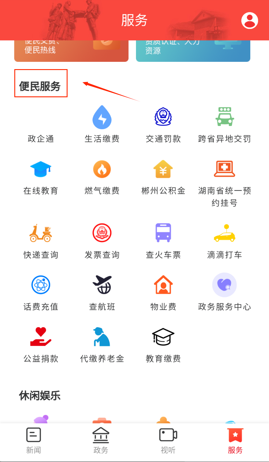 3、进入便民服务区办理生活缴费业务,查询社保公积金和交通违章等信息,预约医院挂号和办理证件等高频事项。