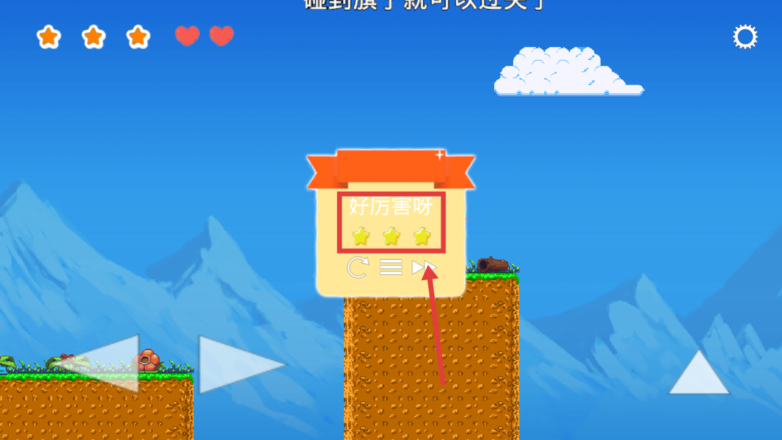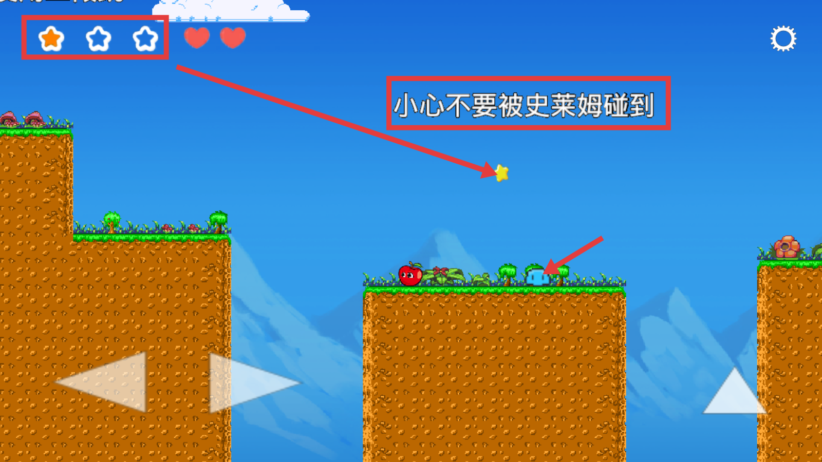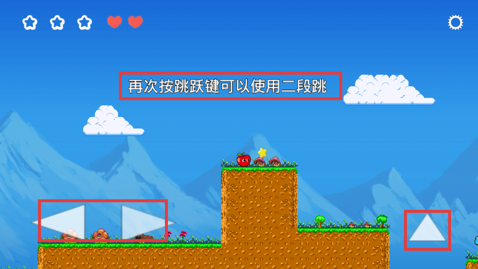 2、闯关时牢记【再次按跳跃键-二段跳】,配合左右移动键跨越地形,收集路上星星。