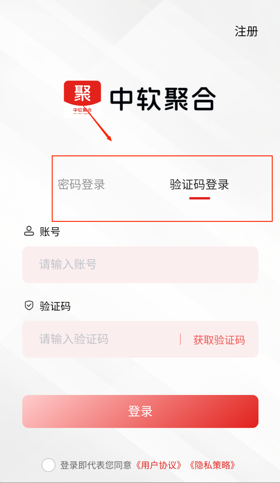 3、登录时可以选择密码登录或验证码登录,输入账号和密码后别忘了勾选同意用户协议,然后点击红色登录按钮。