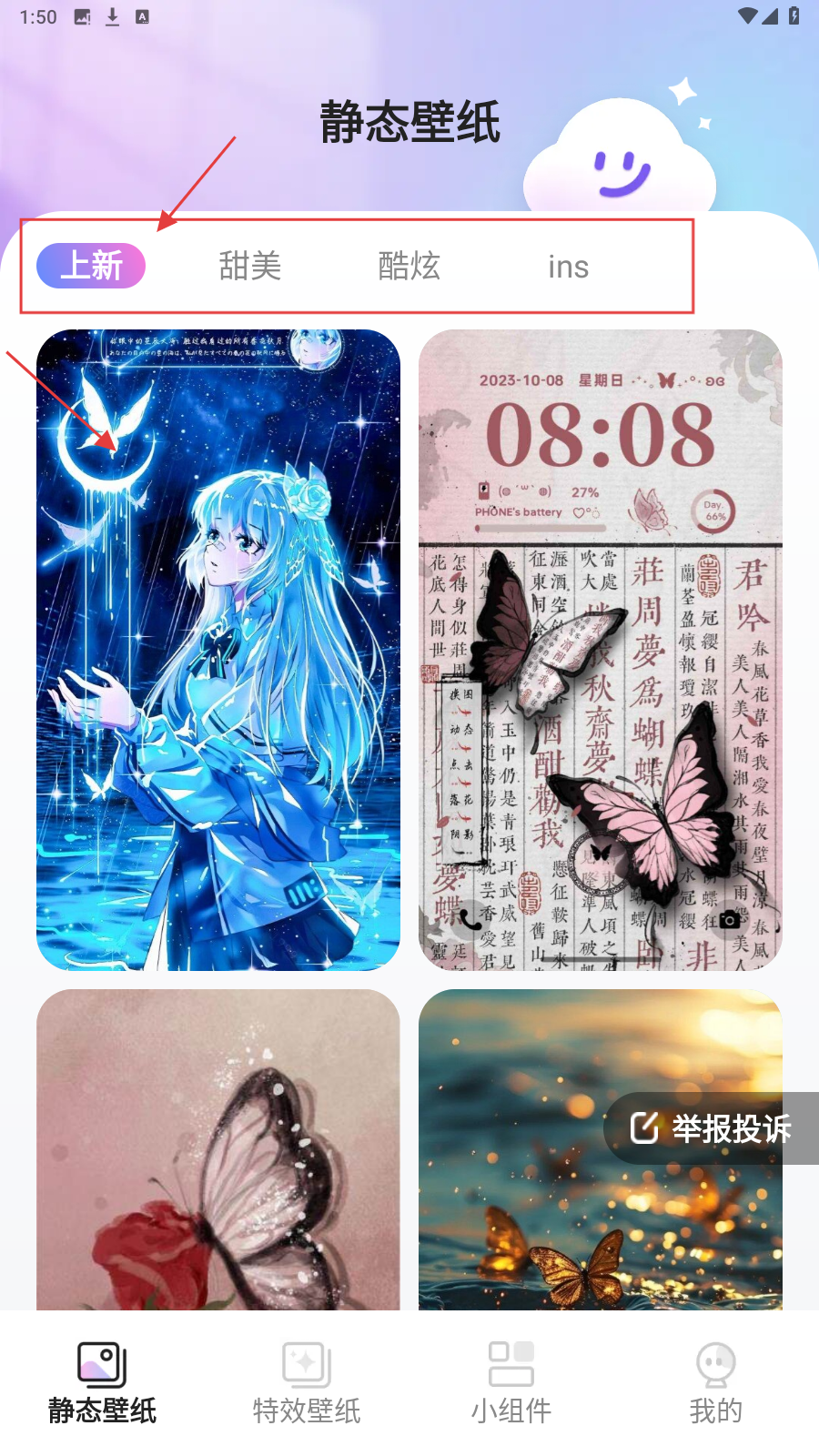 1、进入【静态壁纸】界面,选【上新】标签,浏览并挑心仪壁纸(如动漫风格)。