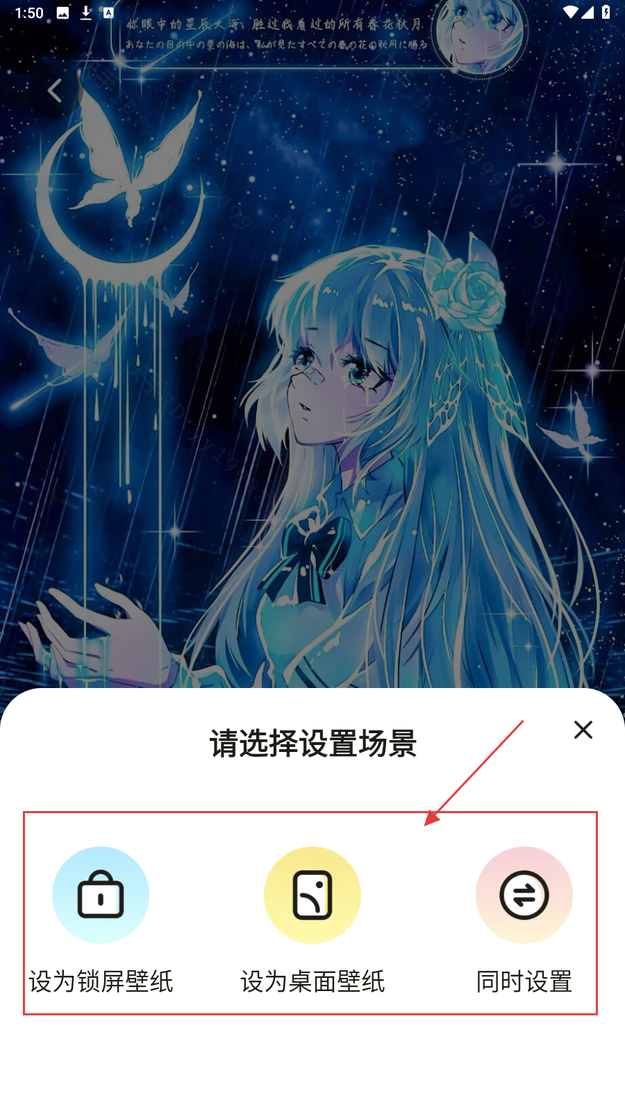 3、在弹出的设置场景中,按需选【设为锁屏/桌面/同时设置】,完成壁纸设置。