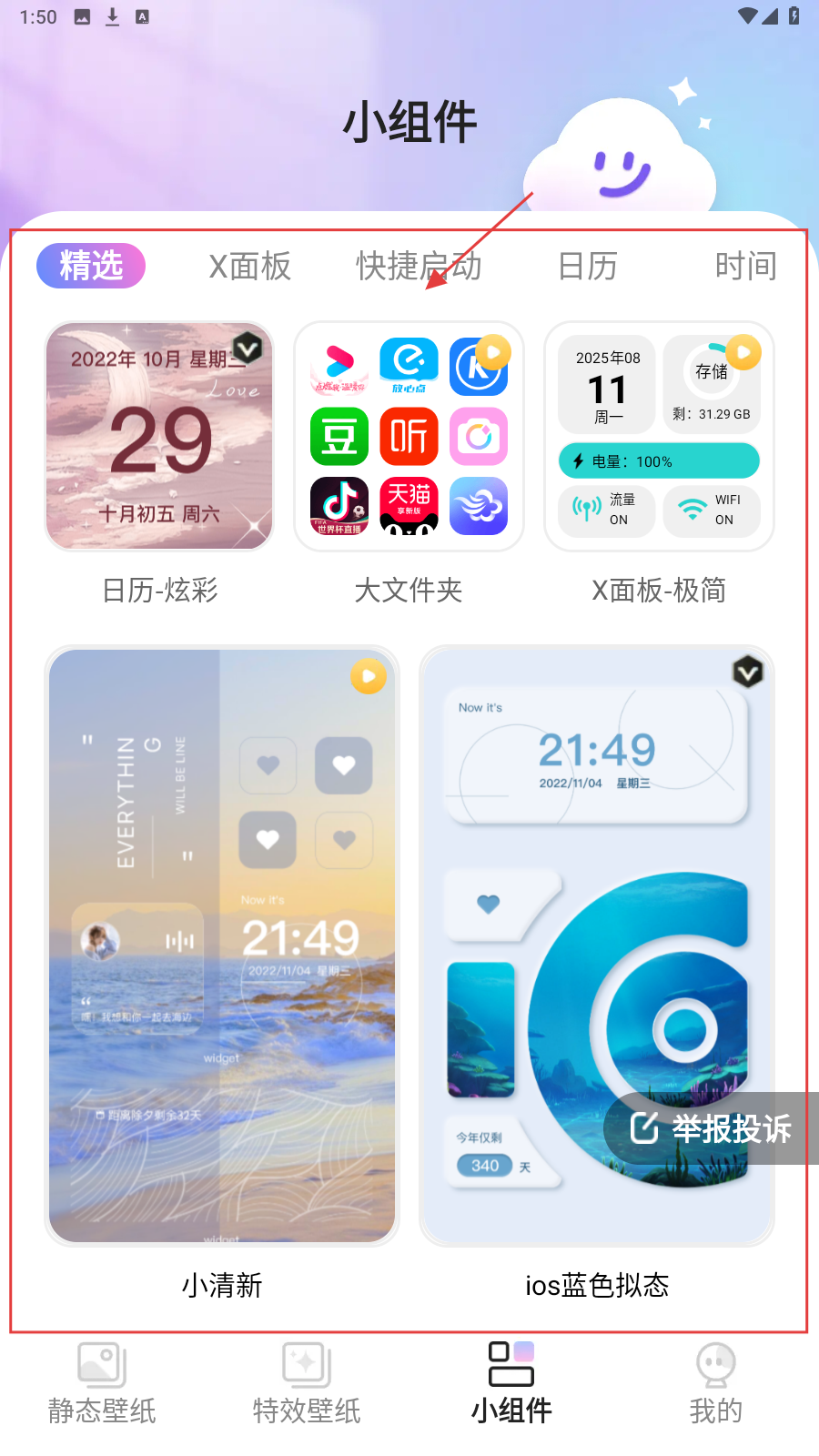 4、切换到【小组件】页,选【精选】等分类,添加心仪组件(如日历-炫彩)美化桌面。