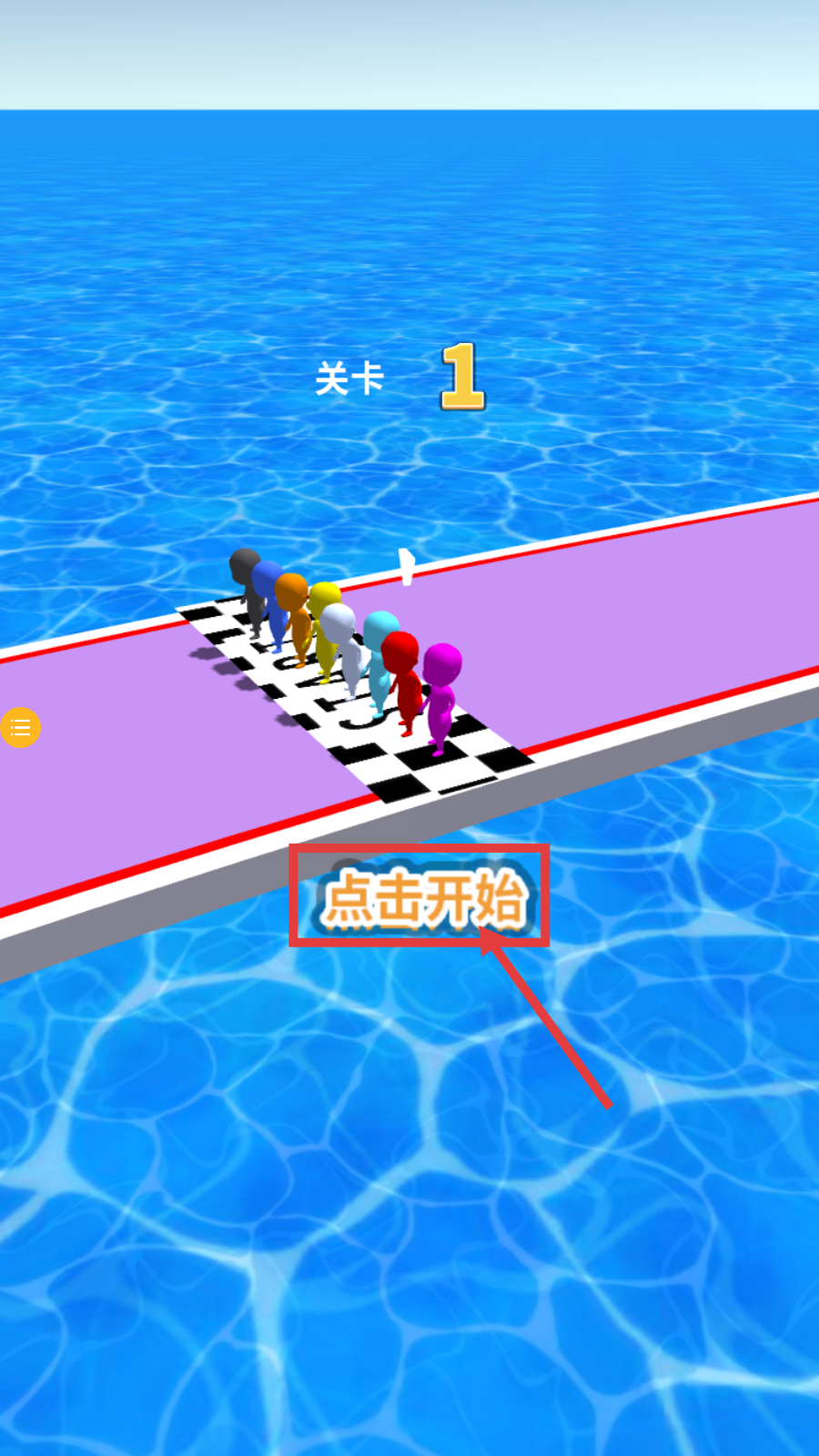 1、关卡1开局点击【点击开始】,启动角色群竞赛,开启海上跑道挑战。