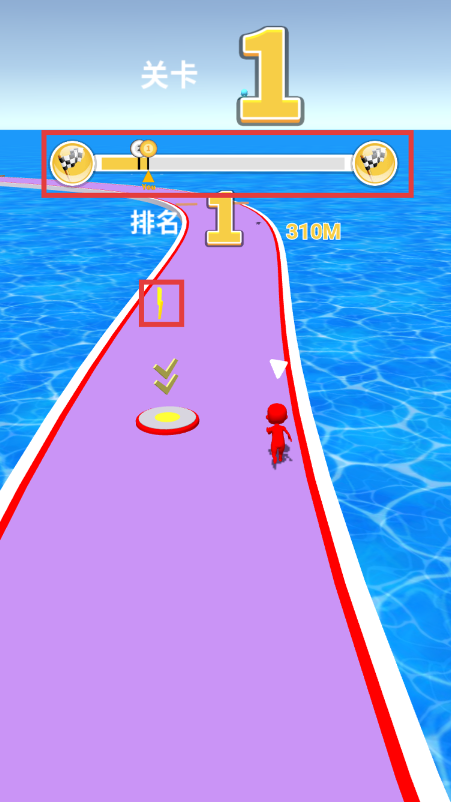 3、跑酷中拾取【闪电】道具,借助加速效果拉开差距,稳固排名第一优势。