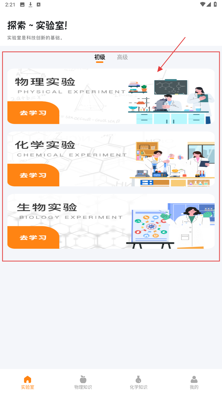 1、进入【实验室】页,选【初级】,点物理/化学/生物实验【去学习】,开启实验课程。