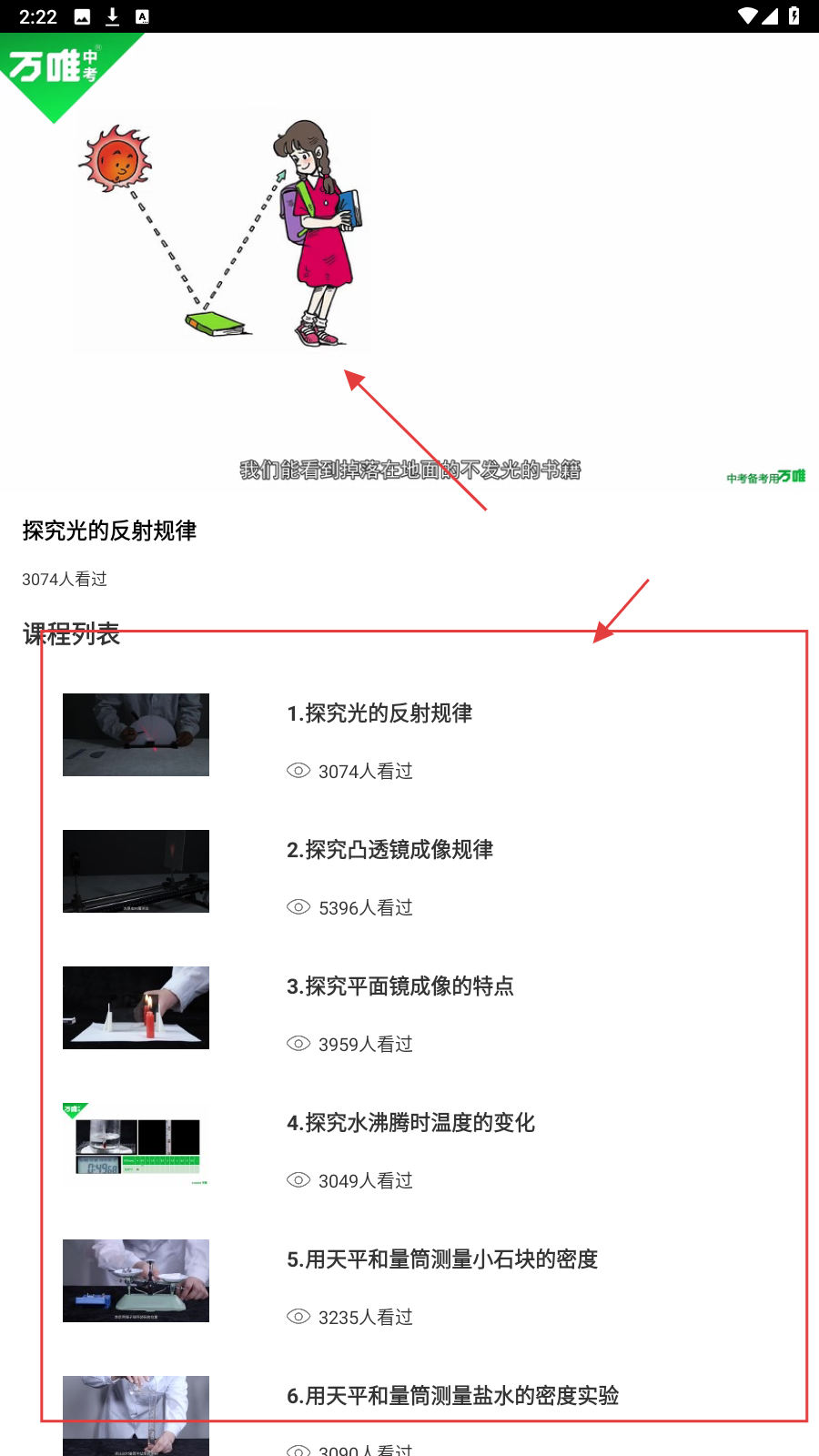 2、在物理实验课程页,选【探究光的反射规律】,看课程列表(如探究凸透镜成像)。