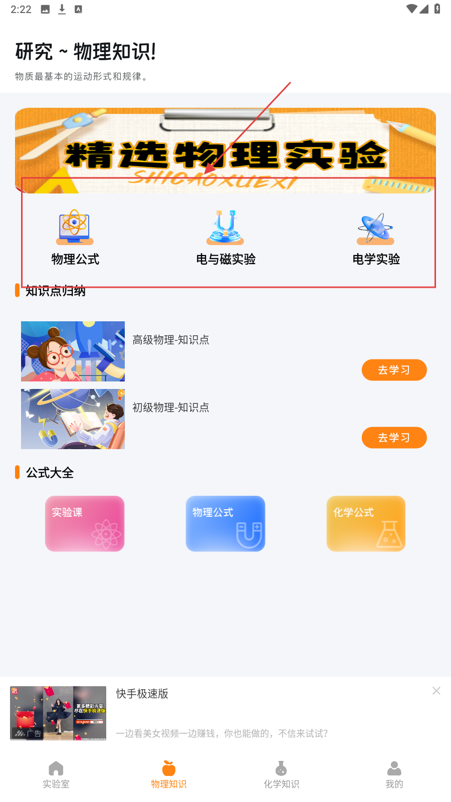 3、切换【物理知识】页,点【物理公式】【电与磁实验】等,学习物理知识模块。
