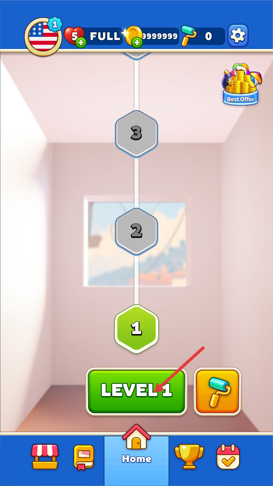 1、主界面点击【LEVEL-1】,借助满体力【FULL】与海量金币,开启首关挑战。