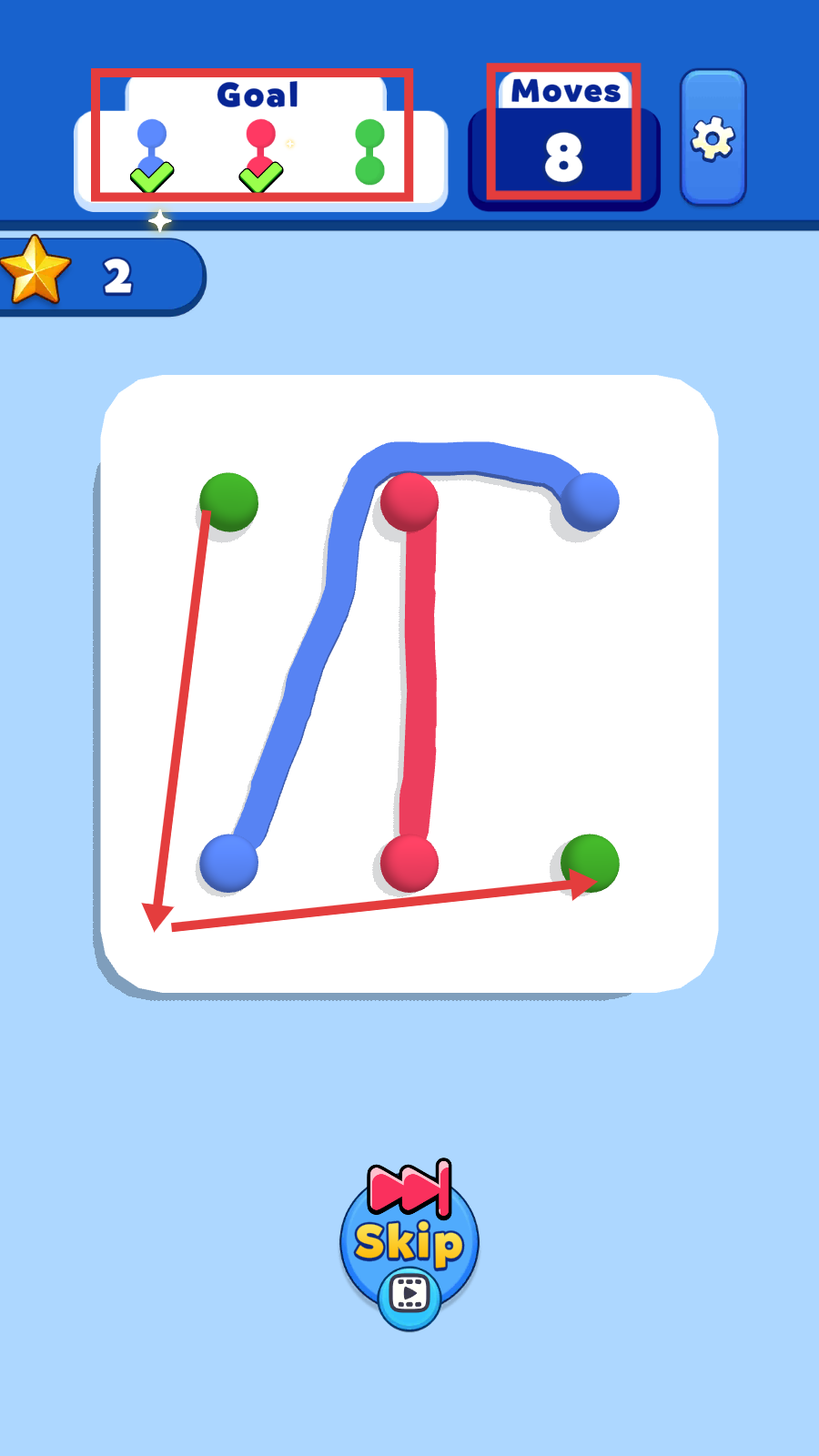 3、关卡内参照【Goal】颜色配对,在【Moves:-8】步数内,规划路径避免线条交叉,完成连接任务。