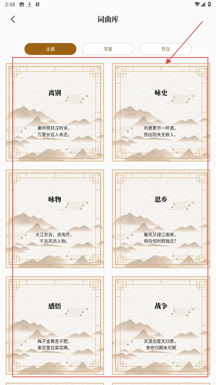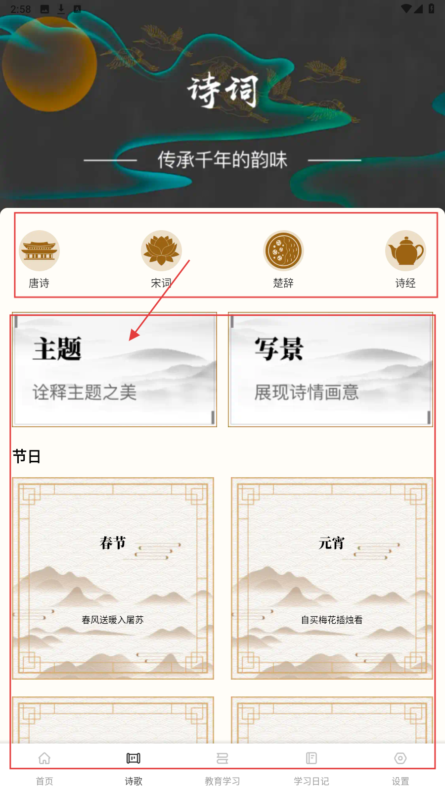 1、进入【诗歌】页,选【唐诗/宋词/楚辞/诗经】,再挑【主题/写景/节日】(如主题)探索诗词。