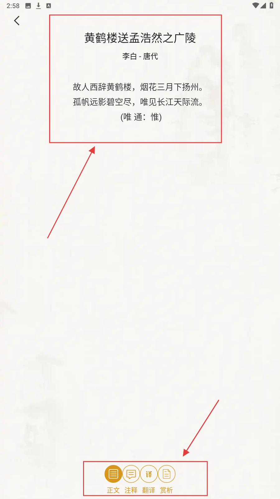 4、进入诗词详情页,可点【注释/翻译/赏析】,深入了解《黄鹤楼送孟浩然之广陵》。