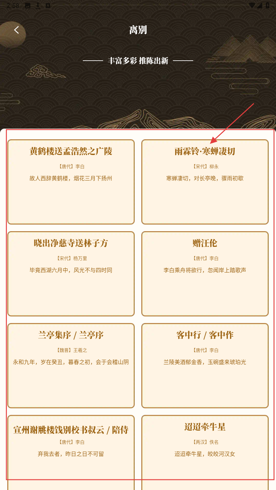 2、在【词曲库-主题】页,选感兴趣主题(如离别),进入对应诗词集合。